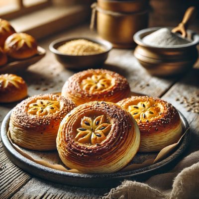 Den Teig ca. 0,5 cm dick ausrollen, mit den gemahlenen Grieben gleichmäßig bestreichen. Den Teig einmal von rechts-, von links-, von oben- und von unten zur Mitte, einschlagen und nochmals ausrollen. Diesen Vorgang 3 - 4 Mal wiederholen. Man kann 2 mal mit Grieben bestreichen und 2 mal mit Schweineschmalz, oder auch nur einmal mit Schweineschmalz, oder nur mit Grieben. Je nach Belieben. Den fertigen Teig letztendlich ca. 3 cm dick ausrollen, mit einem Messer (oder auch Rasierklinge) ganz fein einrizzen (schmale Schnitte auf der Oberfläche die paralell zueinander verlaufen) und mit einer runden Form ca. 5 - 6 cm im Durchmesser ausstechen. Die Bogatschen mit Ei bestreichen, mit Salz und Kümmel bestreuen.