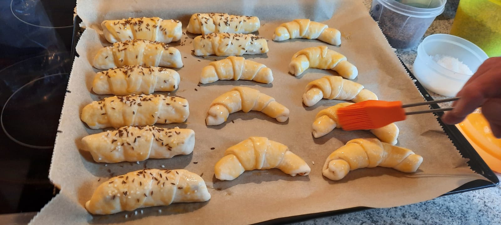 Salz und Öl dazugeben und mit dem Mehl solange vermengen bis eine Masse entstanden ist (mit den Knethaken oder Küchenmaschine). Dann an einem warmen Ort (im Backofen einfach nur das Licht anmachen reicht schon) gehen lassen bis er ca. doppelt so groß ist. Danach den Teig in 6 gleiche Teile teilen und jedes Teil zu einer runden Form ausrollen und in 8 Teile teilen. Jedes Teil von der breiten Seite her zusammenrollen und auf ein Backblech geben. Mit Ei bestreichen und Salz und Kümmel (oder Sesam, Sonnenblumenkerne) darauf streuen. Im Backofen bei ca. 200 ° 18 Minuten backen