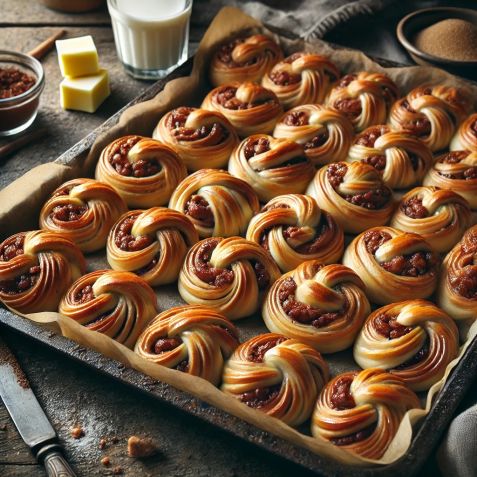 100 g Butter, 80 g Zucker, 2 EL Kakao (Nüsse, je nach belieben) verrühren und auf den Teig streichen. Zusammenrollen und in 2cm dicke Stücke schneiden. Einen Knoten machen.